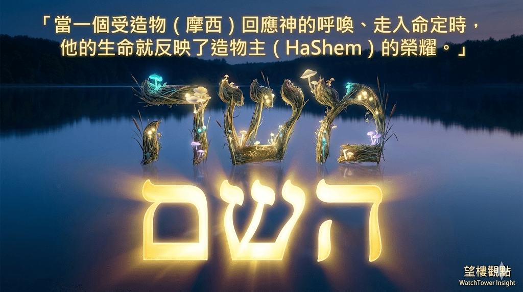 「HaShem」 是猶太人對上帝最尊貴的稱呼。 這個文字上的鏡面關係向我們宣告: 當一個受造物(摩西)回應神的呼喚、走入命定時, 他的生命就反映了造物主(HaShem)的榮耀。