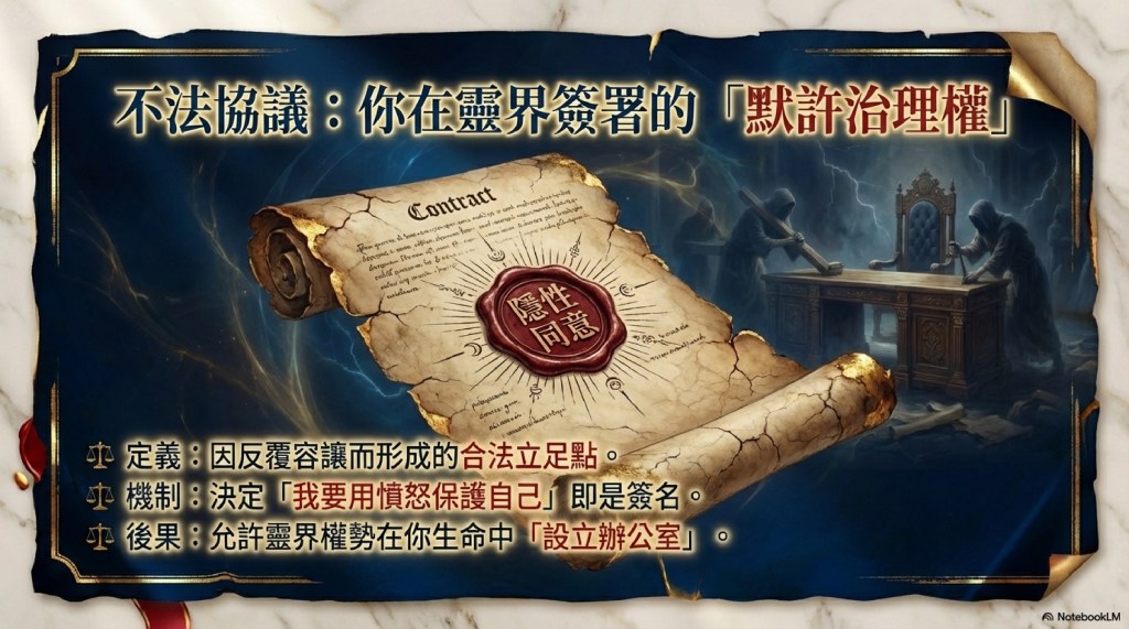 在法律效力上,這等同於你在靈界契約上「簽名」,將原本屬於你的行政權移交出去,允許外部勢力在你的生命中「設立辦公室」。