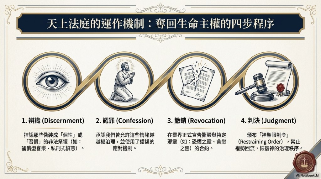 天上法庭是一個屬靈治理機制,用來撤銷仇敵透過不法協議取得的合法權利。